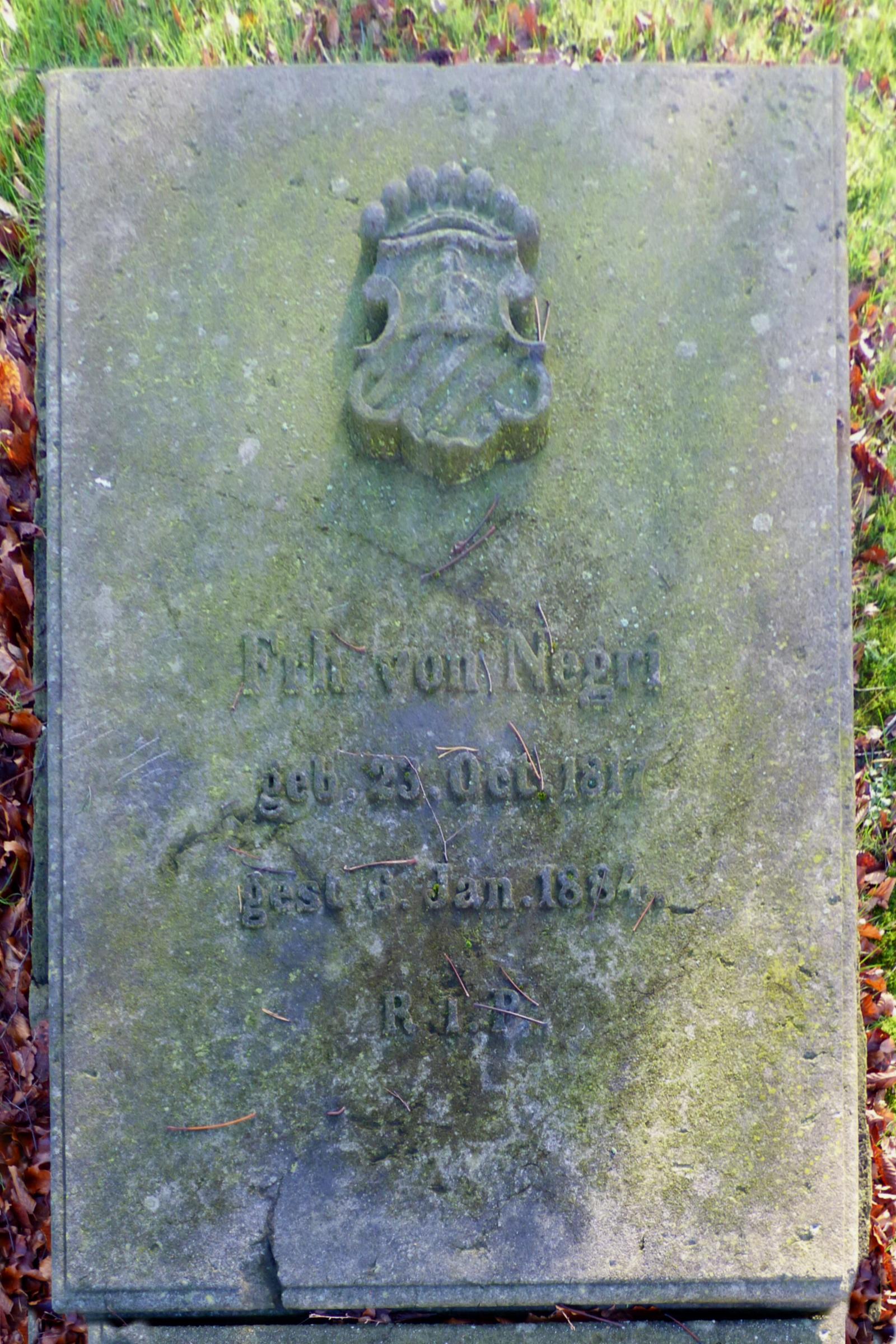 Standort: Die Grabplatte befindet sich auf dem Friedhof an der Annabergstraße 1, im Stadtteil Frelenberg, in der Stadt Übach-Palenberg. Sie ist Bestandteil der Friedhofanlage in Frelenberg. Beschreibung: Bei der Grabplatte handelt es sich um die Platte von: Frh. von Negri geb. 23 Oct. 1817, gest. 6. Jan. 1884 R I P