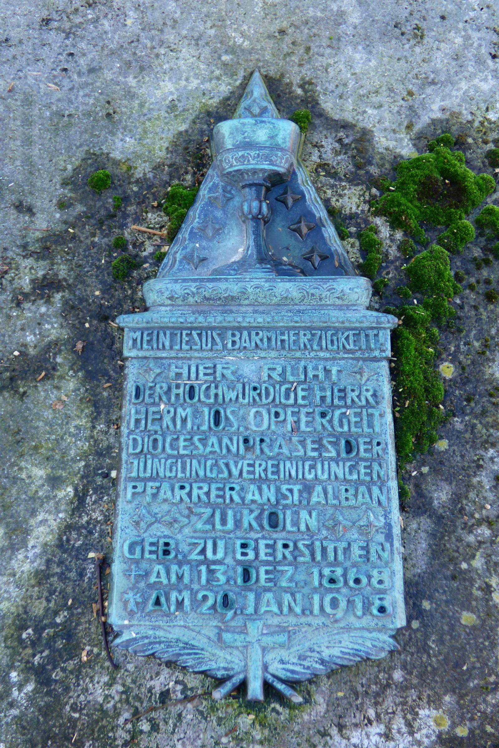 Standort: Das Priestergrab Opfergelt hat seinen Standort an der Peterskapelle im Stadtteil Palenberg, in der Stadt Übach-Palenberg. Beschreibung: Bei dem Priestergrab Opfergelt handelt es sich um eine Grabplatte neben der Karlskapelle.