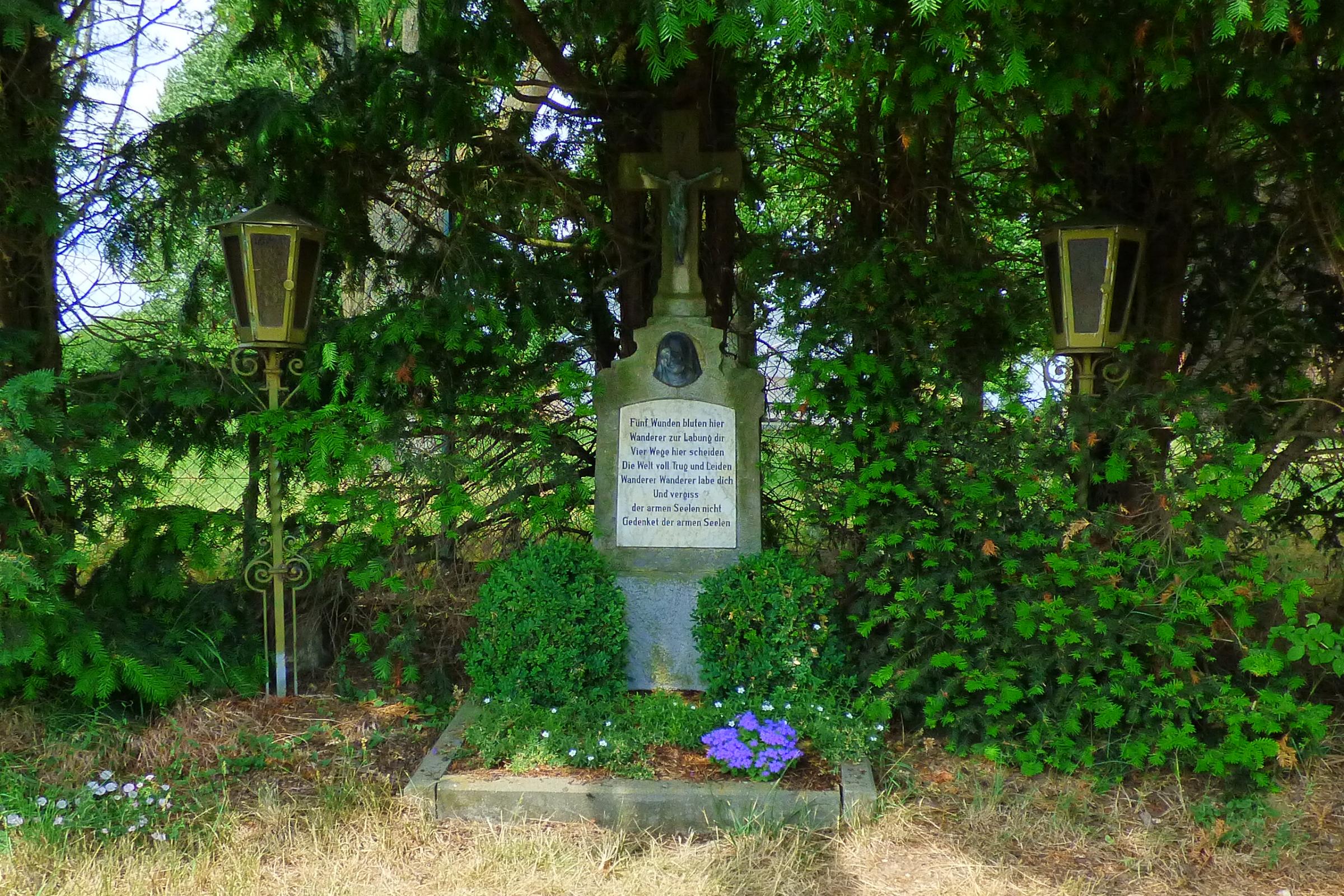 Standort: Das Wegekreuz befindet sich in der Nähe des Wasserturms an der Gangelter Straße, im Ortsteil Hülhoven, in der Stadt Heinsberg Beschreibung: Bei dem Wegekreuz handelt es sich um eine ca. 2,50 m hohes Steinkreuz mit einem Korpus und einer Inschrifttafel: Fünf Wunden bluten hier Wanderer zur Labung dir Vier Wege hier scheiden Die Welt voll Trug und Leiden Wanderer Wanderer labe dich und vergiss der armen Seele nicht Gedenket der armen Seelen