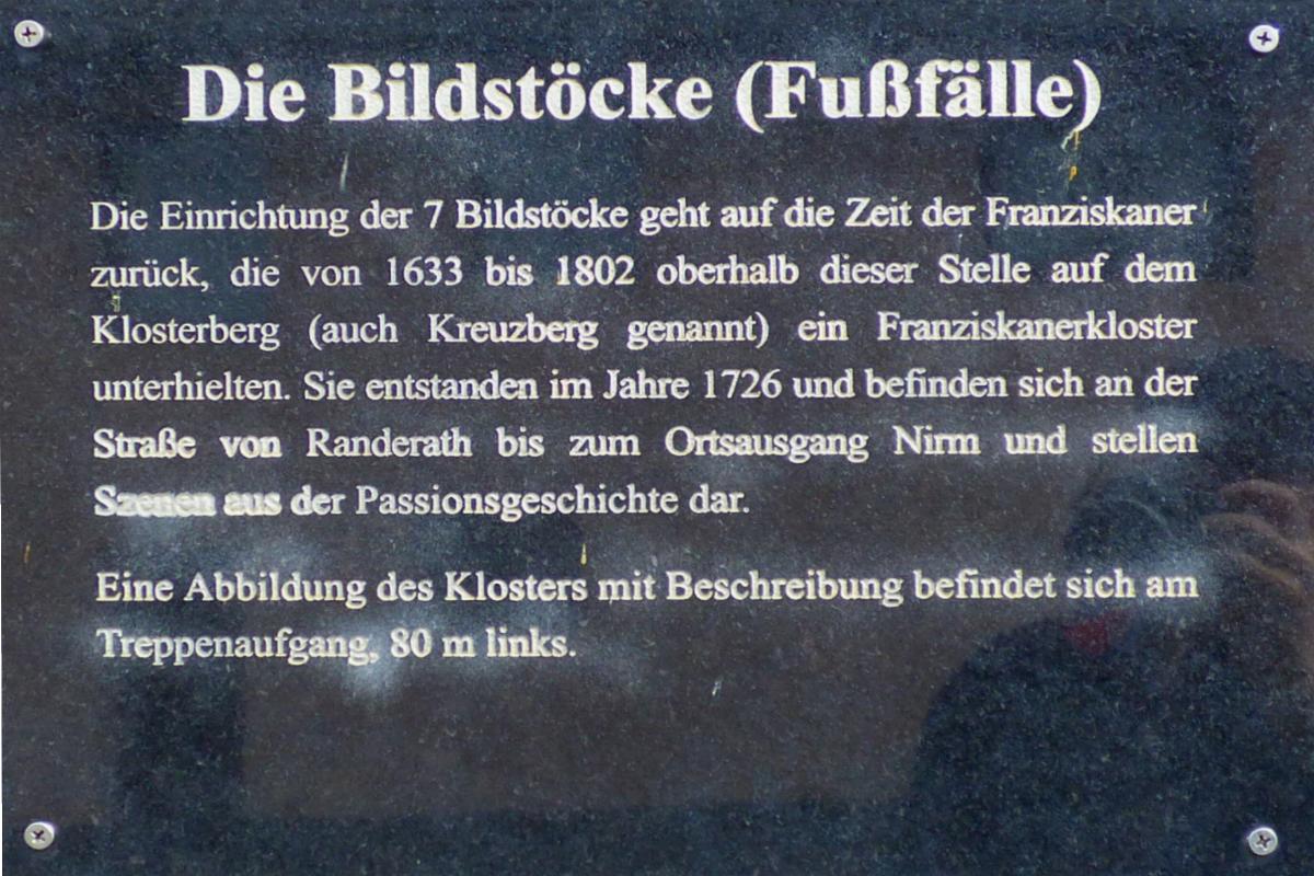 Standort: Die Bildstöcke haben ihre Standorte an der Nirmer Straße im Stadtteil Randerath, in der Stadt Heinsberg. Durch die kommunalen Neuordnungen der Städte und Gemeinden stehen vier der sieben Bildstöcke in Randerath auf Heinsberger Stadtgebiet und drei in Nirm auf Geilenkirchener Stadtgebiet. Beschreibung: Bei den Objekten handelt es sich um ca. 2,00 m hohe Bildstöcke aus Backstein mit einer giebelförmigen Abdeckung. In der Mitte der Bildstöcke sind Bildnisse der Passionsgeschichte dargestellt. Quellenhinweis * Dritte Ausgabe 1994: Handbuch des Bistums Aachen ISBN 3-87448-172-7 S. 731