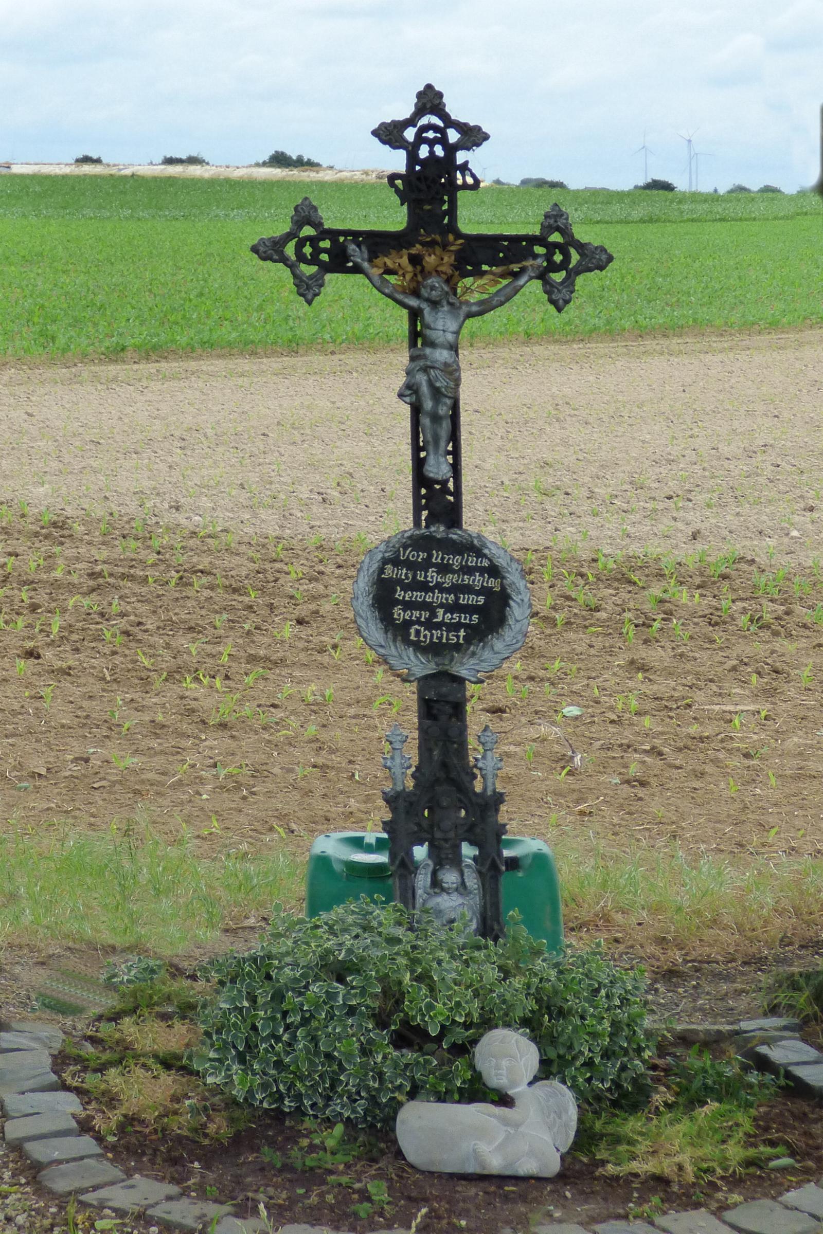 Standort: Das Wegekreuz hat seinen Standort in der Feldlage Mastkaule, im Ortsteil Selsten, in der Gemeinde Waldfeucht. Das Kreuz stammt aus dem 19. Jahrhundert. Beschreibung: Bei dem Wegekreuz handelt es sich um ein ca. 1,80 m hohes Gusseisenkreuz mit einem Metallkorpus. Im Unteren Kreuzteil befindet sich eine Figurennische, in der Mitte des Kreuzes ist ein Infoschild mit dem Wortlaut: Vor Unglück Blitz u. Hagelschlag bewahre uns Herr Jesus Christ.