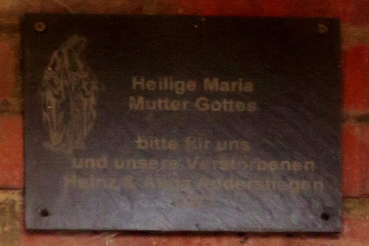 Heilige Maria Mutter Gottes bitte für uns und unsere Verstorbenen Heinz & Anna Andershegen 1977 Standort: Der Madonnen Bildstock hat seinen Standort An der Meer / In der Schleide in Oberkrüchten. Beschreibung: Bei dem Bildstock handelt es sich um einen ca. 1,80 m hohen Ziegelsteinbau mit einer rundbogigen Öffnung unter einem Satteldach. Im Innenraum steht eine Madonnenfigur und Blumenschmuck hinter einem Schmuckgitter.Eine Inschrifttafel ist ebenfalls im Innenraum angebracht. Der Bildstock ist ein wichtiges Zeugnis für die Geschichte des Ortes Oberkrüchten und der Menschen.Quellenhinweis: * Dritte Ausgabe 1994: Handbuch des Bistums Aachen ISBN 3-87448-172-7