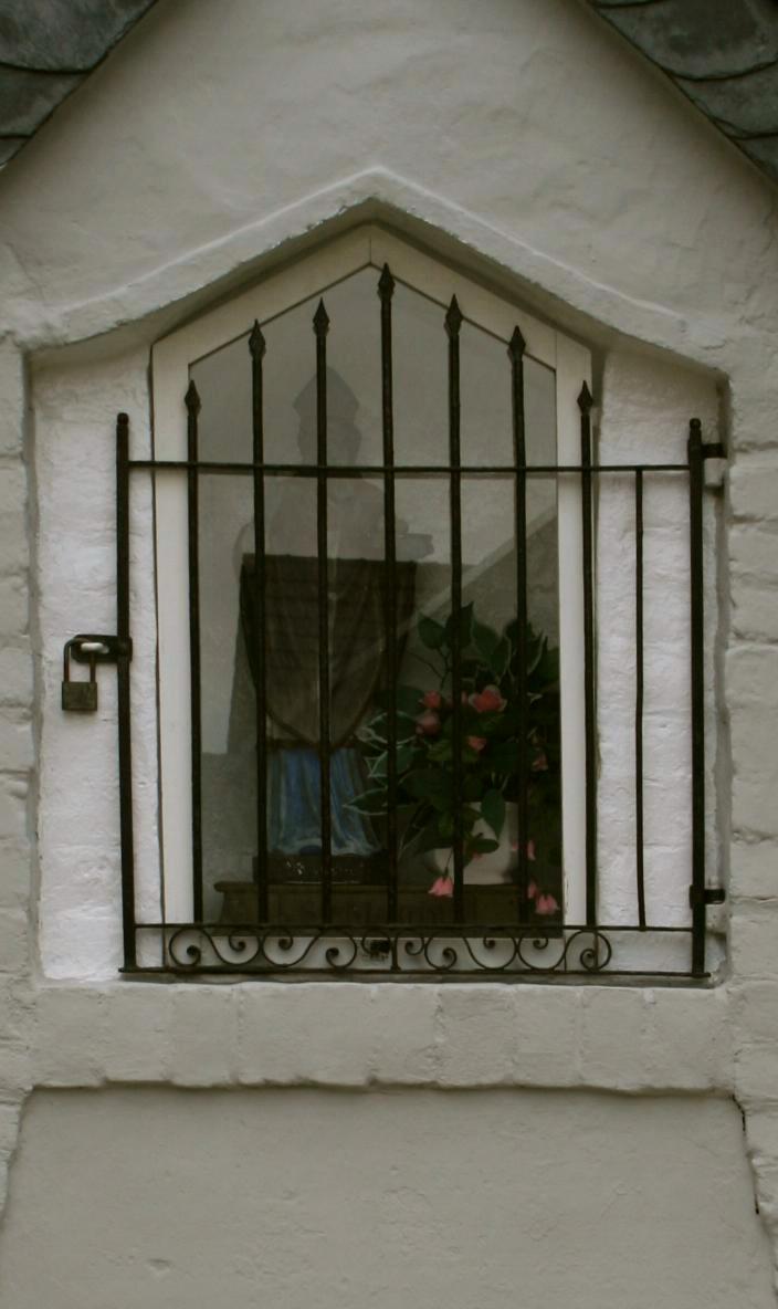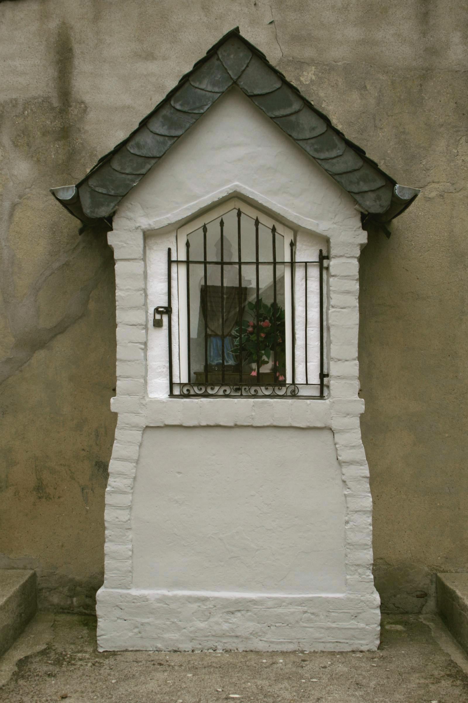 geschlämmt mit Giebel und Nische mit hl. Martinsfigur. Der Bildstock