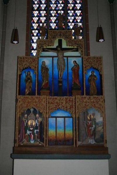 Hochaltar in der Pfarrkirche in Waldenrath Denkmalbeschreibung: Polychromierter Hochaltar des 19. Jahrhunderts bestehend aus drei Tafeln - Kreuztragung und Szene aus dem Leben des hl. Nikolaus - Altarschrein, Bekrönung, Predella und schmückendem Beiwerk wie: Baldachim, Säulen, Hohlkehlen, Fialen und Maßwerk.