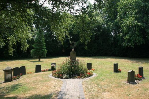 Jüdischer Friedhof in Heinsberg Denkmalbeschreibung: Das genaue Alter des Friedhofes ist unbekannt (vor 1800). Die letzte Bestattung erfolgte 1938. Die Parzelle wurde nach dem 2. Weltkrieg als baumumstandene Rasenfläche neu gestaltet. Etwa in der Mitte ist ein Gedenkstein der Stadt Heinsberg aufgestellt.Um ihn herum wurden etwa kreisförmig elf kleine historische Grabsteine aufgestellt. Ein weiterer Stein, mit stark verwitterter Inschrift -und möglicherweise der älteste erhaltene- steht unmittelbar am Eingang der Anlage. |