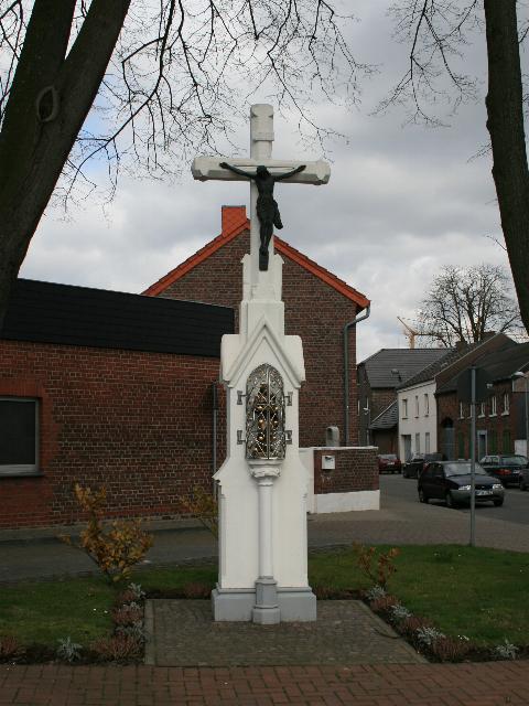 Hochkreuz in Hilfarth Denkmalbeschreibung: Neugotisches Hochkreuz aus Sandstein, gestrichen, Blausteinbasis, Bronze-Korpus, Ende 19. Jahrhundert.