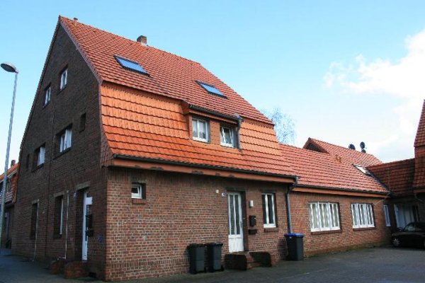 Wohnhaus (Bergarbeitersiedlung) in Hückelhoven Denkmalbeschreibung: Bergarbeiterwohnhaus als Teil der Platzumbauung. Massives Gebäude, teilunterkellert, eingeschossig mit vollausgebautem Mansarddach, traufenständig. Abweichend vom Regelhaustyp ist der Wohnzimmerbereich erkerförmig mit polygonalem Grundriß unter dem normalen Dach vorgebaut. Mauerwerk in Ziegelstein, Tür- und Fensteröffnungen mit stark profilierten Betonstürzen überdeckt. Holzbalkendecken, Holzdachkonstruktion mit Tonpfanneneindeckung. In der Mittelachse des Daches ist eine langgestreckte Dachgaube vorhanden. Das Gaubendach ist in das Oberdach des Mansarddaches integriert. Holztüren und Holzfenster.Gesamtansicht Friedrichplatz 2 - 12