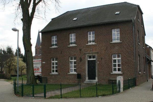 Volksschule in Hilfarth Denkmalbeschreibung: Schulhaus, 2 Geschosse, 4:2 Achsen, Backstein, Türgewände und Fensterbänke in Blaustein, Krüppelwalmdach, Nebengebäude, 1849 (Ankersplinte)