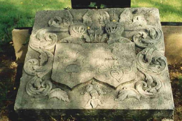 Denkmal Grabplatte Feldges Kreuder in Hückelhoven (Foto: Stadt Hückelhoven 1992) Denkmalbeschreibung: Liegender rechteckiger Gedenkstein mit erhabenem Allinazwappen: Kreuder/ ? (Apfel- oder Hermelindarstellung), Helmzier in barocker Schmuckvielfalt umgibt Wappen; Blaustein.