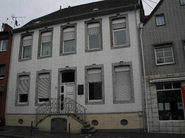 Wohnhaus in Wassenberg Denkmalbeschreibung Dreiflügeliger Stadthof um 1800; Wohnhaus zweigeschossig in fünf Achsen, Backstein, Front verputzt, Türgewände und Fensterrahmen in Blaustein, vor dem Portal eine doppelläufige Treppe mit schmiedeeisernem Geländer, Kellergeschoß mit Blausteinochsenaugen. |