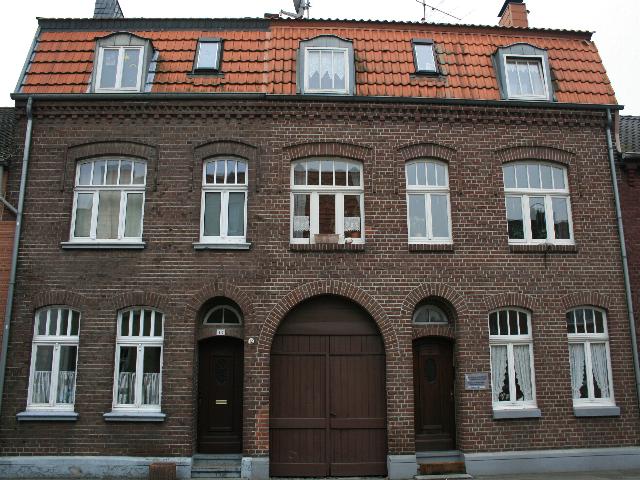 Denkmalbeschreibung: Bei dem Objekt handelt es sich um ein Doppelhaus, symmetrisch aufgebaut in fünf Achsen, wobei dreiflügelige mit zweiflügeligen Fensterachsen abwechseln im 1. Obergeschoß. dort sind sieben Achsen vorhanden, außer jeweils zwei zweiflügelige Fensterachsen. Es folgt eine rundbogige Türachse mit rundbogigen Oberlicht und stichbogiger Tür, wobei die alten Haustüren ebenfalls erhalten sind. Die Mittelachse bildet eine rundbogige Toreinfahrt. Die Fenster im Obergeschoß sind durch vorgezogene Ziegelreihen im Sturzverlauf verziert, ein Klötzchen- und Sägezahnfries bilden das Traufgesims. Fensterbänke und Sockel sind verputzt. Der zweigeschossige Ziegelbau verfügt über aufgesetzte Fugen mit geschweiften Gauben in Rheinlandziegeldeckung. Im Inneren befinden sich noch die originalen Türen und Holzböden sowie der schwarzgemusterte Fliesenboden im Hausengang und die originale Treppe. Das Haus wurde vermutlich in der Zeit um 1910 errichtet.
