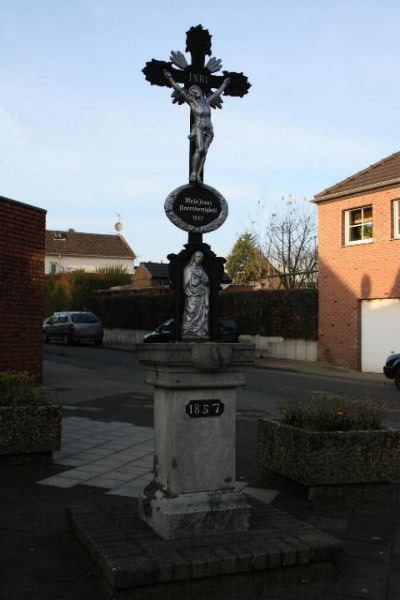 Wegekreuz in Aldenhoven - Niedermerz Denkmalbeschreibung: Inschriftliche Datierung 1857; ca. 4m hohes Wegekreuz auf 2 fach gestuftem neuerem Sockel, darauf Kreuzespfeiler auf Blaustein, mit Gesimsplatte und Sakramentskonsole, darüber gusseisernes Kreuz mit gusseisernen Korpus in neugotischen Formen, Marienstatue am Fuß des Kreuzes. Bedeutend für die Geschichte des Menschen, erhaltenswert aus künstlerischen, wissenschaftlichen, besonders ortsgeschichtlichen sowie volkskundlichen Gründen.
