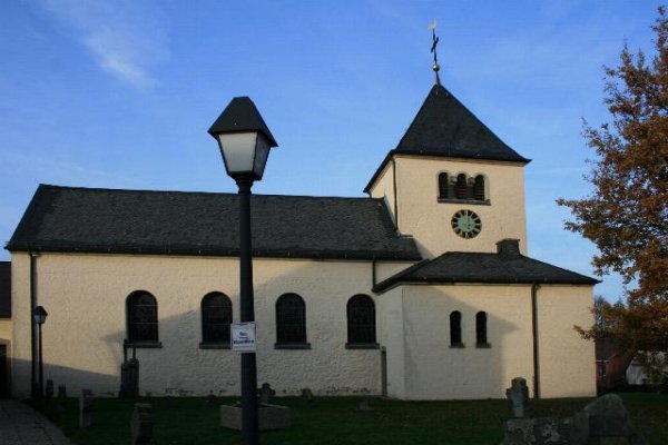 Kath. Pfarrkirche St. Johann Baptist mit Grabkreuzen und Platten in Aldenhoven - Niedermerz $Denkmalbeschreibung: Ostturm 12. Jh., im Oberbau 18. Jh., Langhaus 1742 vergrößert – Decke 1819; 1865 Chor restauriert; kleine Saalkirche mit eingezogenem Ostturm, darin Chor, UG des Ostturmes und Teile des Langhauses Bruchstein, ansonsten Backstein; innen 3 jochiger Saal mit Kreuzgratgewölben und Gurtbögen, 3 rundbogige Außenfenster, Ausstattung 19. Jh. mit Orgelempore, Beichtstuhl, Kanzel, Kommunionbank, Haupt- und Seitenaltären; Fenster modern; Turm mit einfacher Zelthaube, Kirchenschiff mit Satteldach gedeckt, Kleine Vorhalle des 19. Jh.; auf dem zugehörigen Friedhof Grabkreuze und Grabplatten aus Blaustein aus dem 18. Jh. Bedeutend für die Geschichte des Menschen, erhaltenswert aus künstlerischen, wissenschaftlichen, besonders architektur- und ortsgeschichtlichen sowie städtebaulichen Gründen. |