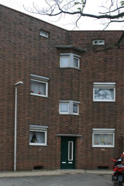 wurde nach Kriegszerstörung als dreigeschossiges Laubenganghaus