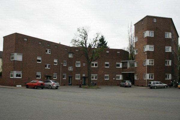wurde nach Kriegszerstörung als dreigeschossiges Laubenganghaus