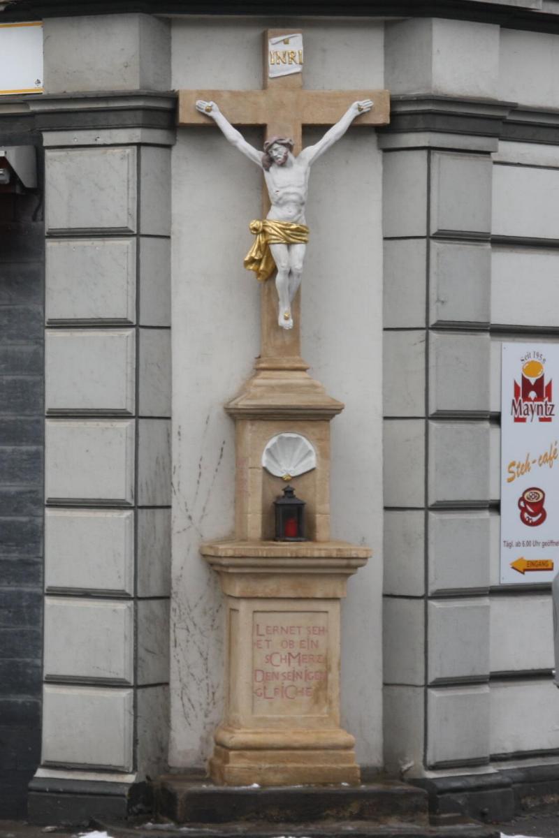 Bonnkreuz in Düren Foto: K-H. Jansen (Nörvenich) Denkmalbeschreibung: Bonnkreuz, Bonner Platz, inschriftlich datiert 1700. Barockes Wegekreuz aus Sandstein auf zweistufigem Sockel, mit Chronogramm aus dem Jahre 1804 und seitlicher Inschrift mit Hinweis auf dem Stifter, neue Farbfassung entsprechend dem Original. Das Kreuz wurde 2012 vollständig restauriert.
