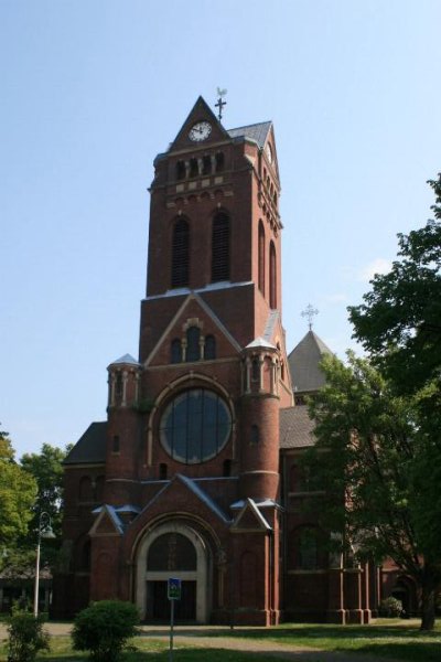 Backstein mit Werksteingliederung in neoromanischen Formen; kreuzförmiger