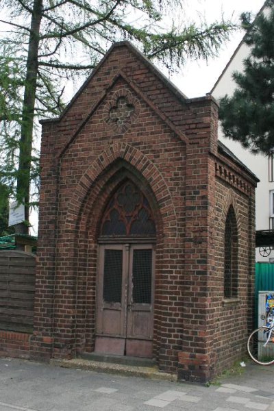 Marienkapelle in Düren - Rölsdorf Denkmalbeschreibung: Marienkapelle, Ecke Monschauer Straße / Kapellenstraße, erbaut um 1890. Kleine, neugotische Backsteinkapelle; 3/8 – Chorabschluß, spitzbogige Seitenfenster; straßenseitiger Giebel mit spitzbogigem Stufenportal, doppelflügelige Originaltür; im Innern originaler neugotischer Altar mit Marienstatue.