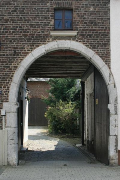 Blausteintorbogen der Hoffassade in Düren - Merken Denkmalbeschreibung: Blausteintorbogen der Hoffassade Peterstraße 4, inschriftlich datiert 1598. Rundbogiger Torbogen mit gefassten Kanten und Datierung im Schlußstein.