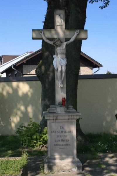 Wegekreuz in Düren - Merken Denkmalbeschreibung: Wegekreuz Ecke Roermonder Straße / Paulstraße, Stadtteil Merken, Mitte 19. Jh. Ca. 3,50 m hohes Wegekreuz aus Sandstein mit originalem gusseisernen Korpus, Rechtecksockel mit Inschrift.