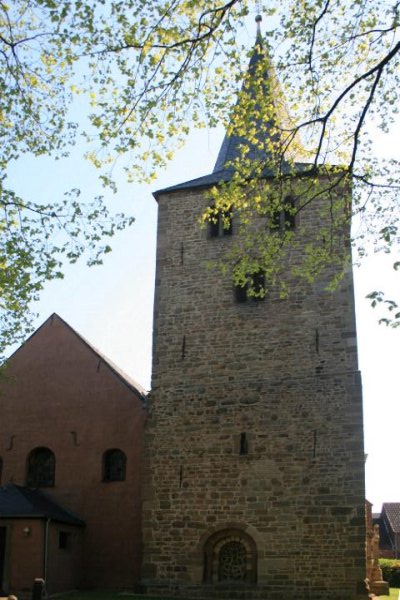 Ehemalige Pfarrkirche St. Arnoldus in Düren - Arnoldsweiler Denkmalbeschreibung: Ehem. Pfarrkirche, erste urkundliche Erwähnung 922. Südseite aus Bruchstein stammt möglicherweise aus dem 10. Jh., quadratischer Turm aus Bruchstein aus dem 12. Jh. mit zweiteiligen romanischen Rundbogenfenstern, dreiseitiger Chorabschluß und Rippengewölbe aus dem 15. / 16. Jh. und Erweiterung um ein zweites Schiff, von dem nur der Westgiebel und die Fundamente erhalten sind, Mittelschiff aus Backstein von 17. / 18.Jh nur als Ruine erhalten.