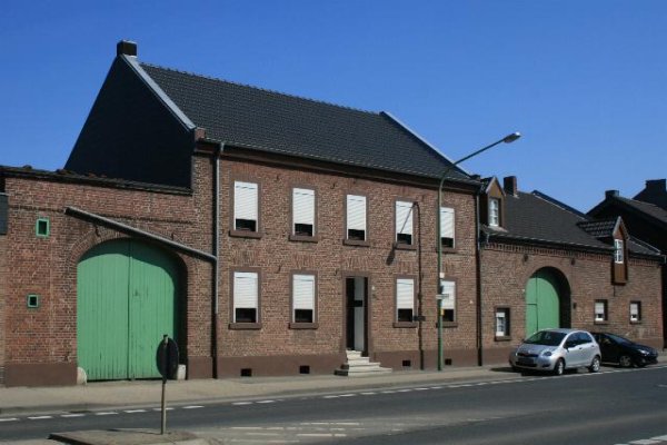 Hofanlage in Düren - Arnoldsweiler Denkmalbeschreibung: Hofanlage, inschriftliche Datierung 1841. Zweigeschossiges Wohnhaus aus Backstein, traufständig mit Satteldach, fünfachsig, Fenstergewände aus Blaustein; anschließendes niedriges Wirtschaftsgebäude aus Blaustein mit rundbogiger Toreinfahrt.