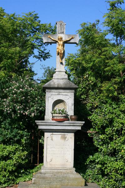 Wegekreuz in Düren - Arnoldsweiler Denkmalbeschreibung Wegekreuz Trierer Straße, Stadtteil Arnoldsweiler, Datierung durch Chronogramm 1846. Ca. 4 m hohes Blausteinkreuz auf gestuftem Sockel mit lateinischer Inschrift, originaler gusseiserner Korpus, Beschädigung am Querbalken des Kreuzes.