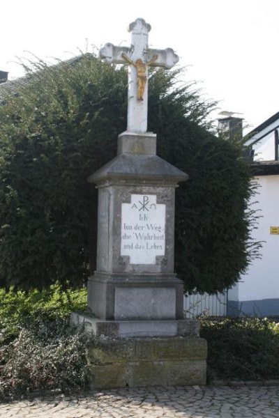 Wegekreuz in Düren - Lendersdorf Denkmalbeschreibung: Auf einem gemauerten Natursteinsockel steht ein ca. 3 m hohes mehrfach gestuftes Kreuz aus Blaustein. Im Mittelteil eine Inschrifttafel. Der Korpus ist aus Gußeisen. |