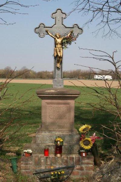 Wegekreuz (Rotes Kreuz) in Düren - Lendersdorf Denkmalbeschreibung: Das ca 2 m hohe Kreuz steht auf einem gemauerten Sockel. Darauf ein gestufter Mittelteil aus rotem Sandstein mit Inschrift. Das Metallkreuz mit Kleeblattenden trägt ein gußeisernes Kruzifix.