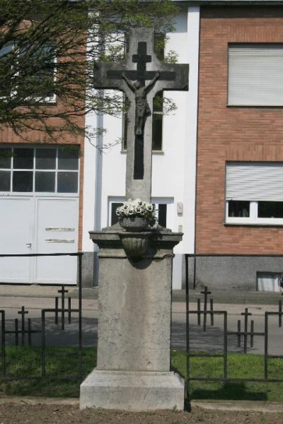Wegekreuz in Düren - Gürzenich Denkmalbeschreibung: Wegekreuz gegenüber Haus Schillingsstraße 161, inschriftlich datiert 1853. Ca. 3 m hohes Wegekreuz aus Blaustein, Stifterinschrift im Kreuzespfeiler, Kreuz mit Eckrundungen und neuerem gusseisernen Korpus.