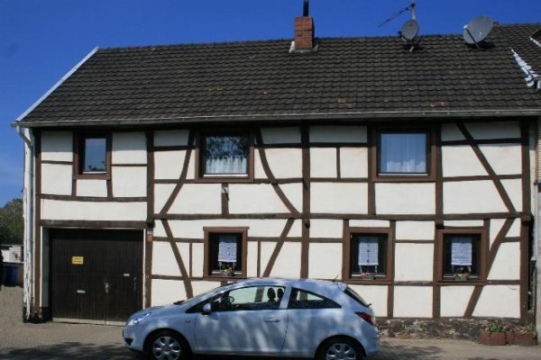 Fachwerkhaus in Düren - Gürzenich Denkmalbeschreibung: Haus Schillingsstraße 106, inschriftliche Datierung im Türsturz 1764. Traufenständiges, zweigeschossiges Fachwerkhaus einer ehemaligen Hofanlage, mit Satteldach und rechteckiger Tordurchfahrt, Fachwerkkonstruktion mit eingehälsten Ankerbalken, Fensteröffnungen vergrößert.