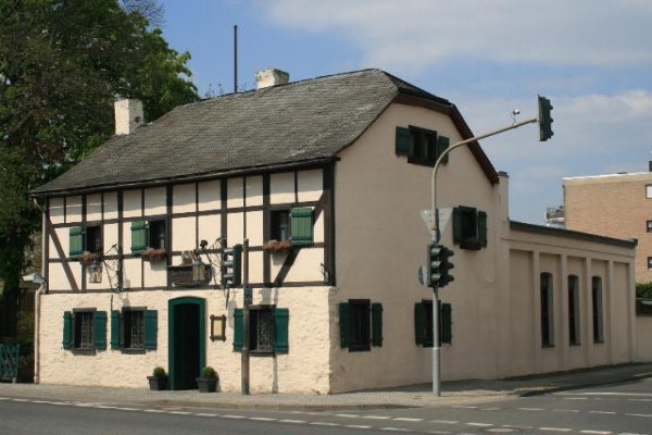 "Breuers Häuschen" in Düren - Gürzenich Denkmalbeschreibung: Sogenanntes „Breuers Häuschen“, Valencienner Straße, erbaut Mitte 18. Jh. Kleines, im Innern gut erhaltenes Wohnhaus mit Gaststätte, zweigeschossig, traufständig, Straßenseite im Erdgeschoß Bruchsteinmauerwerk, Obergeschoß neues, dem historischen Vorbild entsprechendes Sichtfachwerk, Ostgiebel verputztes Fachwerk, Westgiebel Backsteinmauerwerk Ende 19. Jh., verschiefertes Krüppelwalmdach.