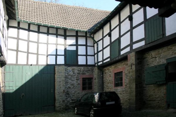dem Türsturz anno 1643; mehrteilige Anlage aus Bruchstein mit Fachwerk