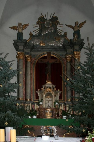 Ölgemälde im Chorraum (18. Jahrhundert); rechts Christus am Kreuz (lt.