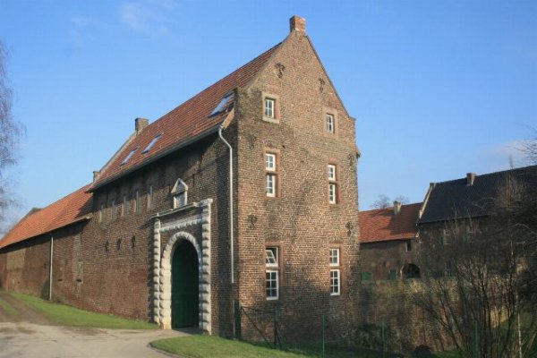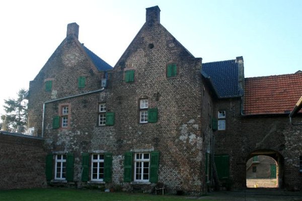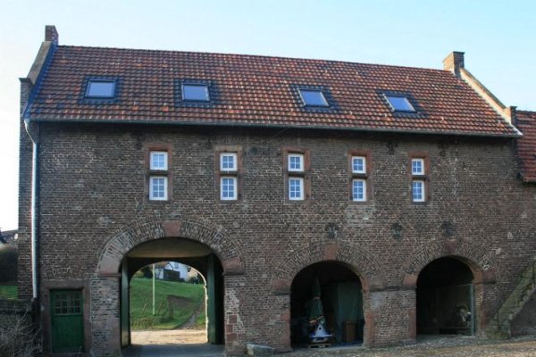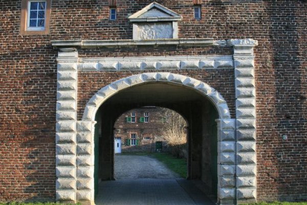 Torbau (4) Nach Clemen soll der Torbau um 1600 entstanden sein. Nach Kriegszerstörung wurde er ca. 1955 instandgesetzt. Der Torbau ist breitgelagert mit korbbogiger Durchfahrt, außen bossiertes Blausteinportal mit Sims und übergiebeltem Allianzwappen von 1706. Die äußeren Fenster sind verändert, zum Hof hin sind im Obergeschoß quergeteilte Originalfenster. Im