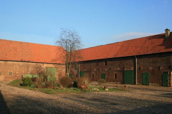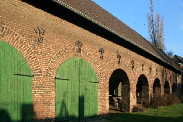 Wirtschaftsgebäude (5,6,7) 18. Jahrhundert, nach Clemen sollen die Wirtschaftsgebäude 1703 umgeändert worden sein. Äußerlich weitgehend unverändert, nur wenige neue Öffnungen zur Hofseite. - Ehemalige Scheune mit rundbogiger Toreinfahrt (6) - Ehemalige Stallungen (5) - Ehemalige Stallungen mit korbbogiger Tordurchfahrt und Spuren zugemauerter Torbogen. (7) c)