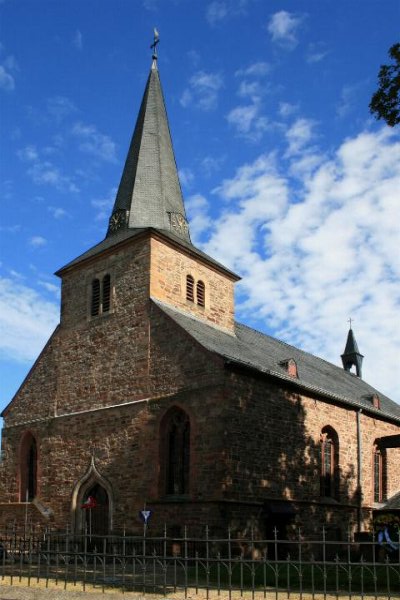 Hallenkirche in Kreuzau - Drove Denkmalbeschreibung: Bei dem Objekt handelt es sich um eine dreischiffige Hallenkirche mit Westturm und Rechteckchor. Sakristeianbau aus Bruchstein mit Buntsandsteineingliederungen. Eingang im Westturm. Der Turm trägt ein Dach mit spitzer Haube, das Langhaus schützt ein Satteldach.