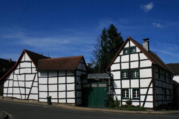 Fachwerk - Hofanlage in Kreuzau - Drove Denkmalbeschreibung: Bei dem Objekt handelt es sich um eine 4-flügelige Fachwerk-Hofanlage, Wohnhaus 2-geschossig an der Ecke In der Britz/Drovestraße in Geschoßbauweise. Im Anschluß an die Giebelseite des Wohnhauses große Tordurchfahrt, daneben Wirtschaftsgebäude mit teilweise ausgemauerten Fachwerk.