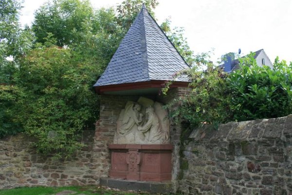 ist mit einer Bruchsteinmauer umgeben, in der neuere Kreuzwegstationen