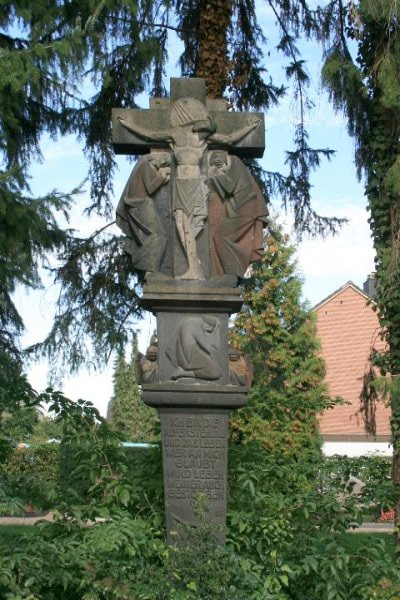 Kreuzigungsgruppe auf dem Friedhof in Kreuzau Denkmalbeschreibung: Bei dem Objekt handelt es sich um eine expressionistische Kreuzigungsgruppe aus Basaltlava auf einem hohen pfeilerförmigen Sockel, darin die Inschrift: „ Ich bin die Auferstehung und das Leben. Wer an mich glaubt wird leben, wenn er auch gestorben ist!“. Auf einer kräftigen Gesimsplatte die Darstellung einer Trauernden mit 2 seitlich hockenden Engeln, darüber Gesimsplatte mit der Kreuzigungsgruppe. Insgesamt eine ungewöhnlich qualitätsvolles seltenes Werk.