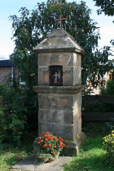 Bildstock in Kreuzau - Leversbach Denkmalbeschreibung: Der Bildstock aus Sandstein mit neuem Betonsockel, mittlerem Gesims, pyramidenförmiges Dach, segmentbogiger Rechtecknische mit stark verwitterter originaler Christusdarstellung im Relief der Nischenrückwand, darüber Stifterinschrift und Kreuz sowie Datierung.