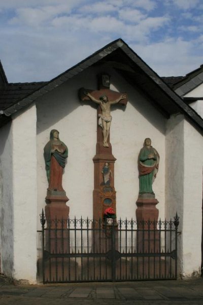 Kreuzigungsgruppe in Kreuzau - Stockheim Denkmalbeschreibung: Bei dem Objekt handelt es sich um eine große Kreuzigungsgruppe aus Buntsandstein in einer überdachten Nische. In der Mitte Pfeiler mit von Engelskopf getragenen Konsole und Nische mit reicher Rocailleornamentik, Darüber Relief der Hl. Katharina, Kruzifix mit Steinkorpus, Reste farbiger Fassung. Zur rechten auf geschweiftem Pfeiler die Statue des Hl. Johannes, zur linken die Gottesmutter. Auf dem Sockel des Kreuzes die Stifterinschrift: „Heinrichs Hamacher und Sibilla Nesselrath, 6. Juni 1770“.