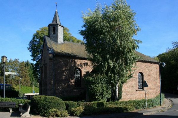Marienkapelle in Kreuzau - Üdingen Denkmalbeschreibung: Die Marienkapelle aus Bruchstein steht auf einem kreuzförmigen Grundriss und zeigt Buntsandsteingewände. Der Westgiebel besitzt Maueranker die eine Datierung von 1786 angeben. Der Westeingang ist rundbogig mit einer Freitreppe. Der 8-eckige Dachreiter mit eine Glocke hebt sich vom Walmdach ab. Die Kapelle wurde nach der Kriegszerstörung völlig erneuert. Im Innenraum ein barocker Marienaltar mit farbig gefasstem Holz, 2 Christusstatuen, ebenso kleinere Heiligenstatuen im Langhaus und eine sehr ländliche Gruppe Maria, Jesus, Josef auf Konsolen aus dem 18. Jahrhundert. |