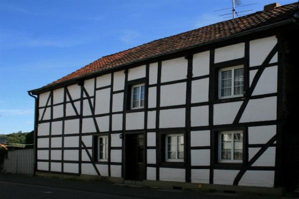 Fachwerk - Wohn - Stall - Haus in Kreuzau - Boich Denkmalbeschreibung: Bei der Anlage handelt es sich um ein 2-geschossiges Wohn-Stall-Haus aus Fachwerk, rechter Teil als Wohnhaus genutzt. Fachwerk in Geschossbauweise mit großen Fußbändern. In der linken Haushälfte ursprünglich mit Toreinfahrt, die heute zugemauert ist. Am linken Teil unter Pultdach abgeschleppter Anbau mit Satteldach.