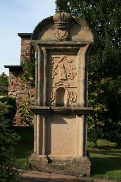 Denkmalbeschreibung: Bei dem Objekt handelt es sich um einen Bildstock aus Buntsandstein aus dem 18. Jahrhundert. Der Bildstock ist stark restauriert, pfeilerförmiger Aufbau mit profiliertem Rand, Sockel mit Gesims, mittlerem verkröpftem Gesims, im oberen Teil kleine Nische mit apsidialem Abschluß, begleitet von Rocaillenschmuck, darüber der kreuztragende Christus mit umrankender Dornenkrone, im Oberteil als Abschluß halbrunder Sprenggibel mit Wappen und Fürstenhut, Inschrift im Sockel stark verwittert, teilweise durch Restaurierung verwischt.
