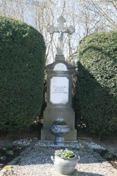 Wegekreuz in Langerwehe - Stütgerloch Denkmalbeschreibung: Um 1900; Wegekreuz aus Muschelkalk; Pfeiler mehrfach gestuft, Inschriftenplatte, dachförmiger Abschluß, kleines Blausteinkreuz mit gussartigem Corpus und Kleeblattenden.