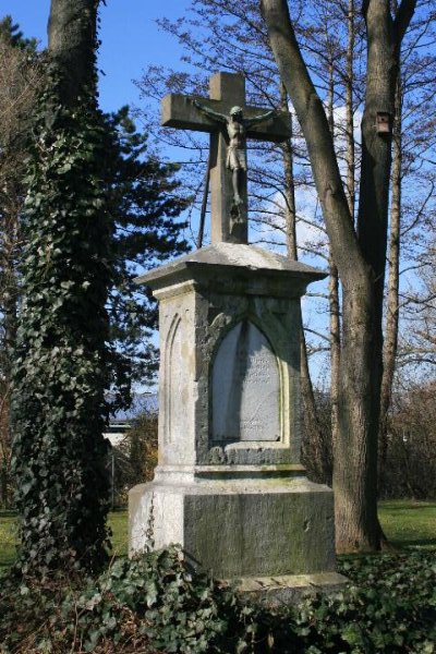 Wegekreuz in Langerwehe - Luchem Denkmalbeschreibung: Inschriftliche Datierung 1886, Wegekreuz auf mehrfach gestuftem Blausteinsockel, im Schaft spitzbogige Inschriftenfelder, darüber Gesims, Kreuz und gußeiserner Korpus.