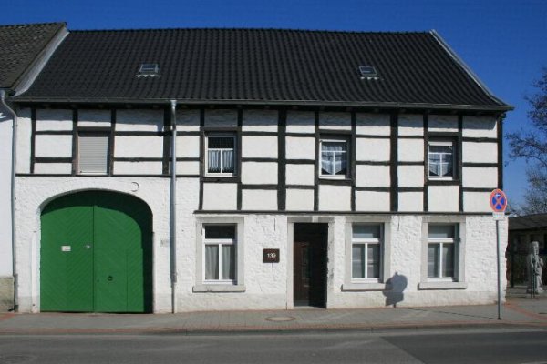Wohnhaus in Langerwehe Denkmalbeschreibung: Erste H. 19. Jh.; modern überarbeitet; 2-geschossiges, traufenständiges Wohnhaus, EG Bruchstein mit Blausteingewänden, links flachbogige Tordurchfahrt, geschlämmt; OG Fachwerk; Türen und Fenster modern, Satteldach.