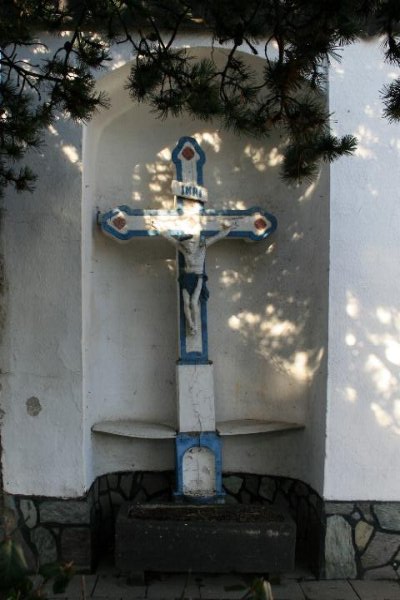 Hauskreuz in Merzenich - Golzheim Denkmalbeschreibung Baujahr: um 1860; in Hausnische eingestelltes, plumpes Holzkreuz mit 3-Paß-Endungen und Nischen-Konsole im Sockel, hölzerner Korpus, Kreuz und Korpus farbig gefasst. Nach Auskunft der Eigentümerin um 1988 farbig gefasst, Einfassung, auch um die Nischenkonsole, blau, die Wunden Christi rot gefasst, der Korpus weiß, die Dornenkrone und der Lendenschurz blau gefasst, ebenso die Inschrift INRI, übliche Teil weiß.