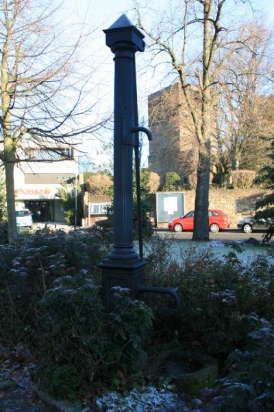 Pumpe in Merzenich Denkmalbeschreibung: Um 1850, gußeiserne Pumpe mit kanneliertem Säulenschaft und verzinktem Schwengel, vor der Pumpe ein kleines halbrundes Becken. |